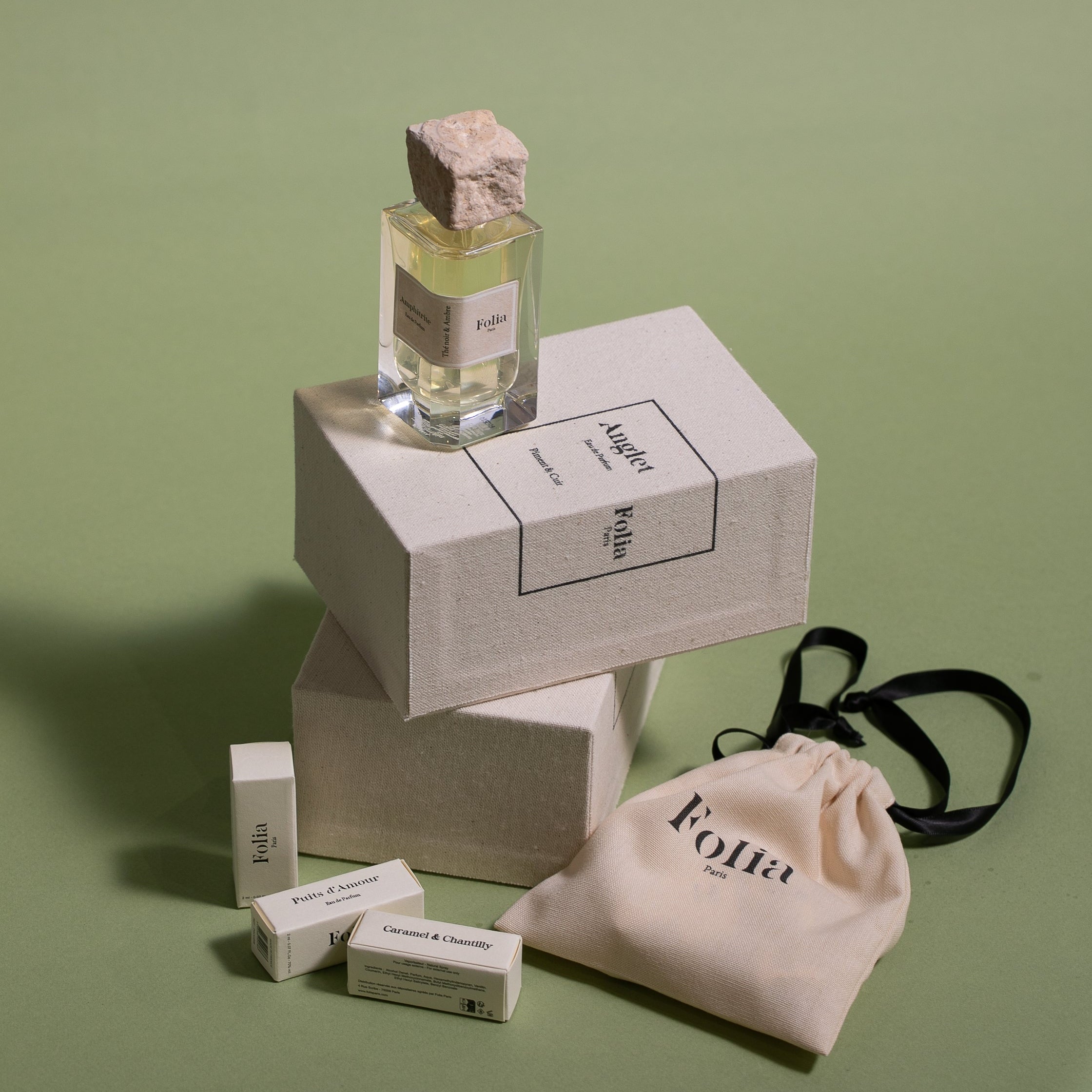 Dans son petit pochon en coton, retrouvez l'intégralité de nos 6 premiers parfums en format échantillon 2 ml !